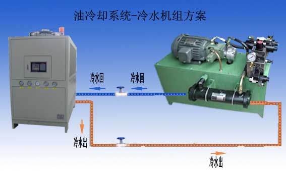 下面的方案就是選用工業(yè)冷水機(jī)組來冷卻油溫,工作流程示意圖請參照以下圖片示例: